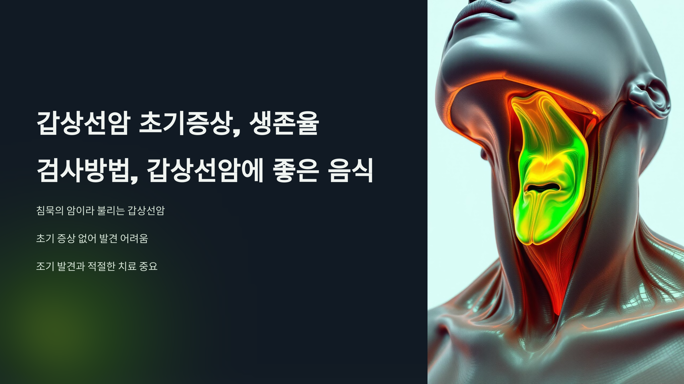 침묵의 암이라고도 불리는 갑상선암은 초기에는 특별한 증상이 없어 알아차리기 어려울 수 있습니다. 하지만 조기에 발견하여 적절한 치료를 받는 것이 중요합니다. 이 글에서는 갑상선암의 초기 증상, 생존율, 효과적인 검사 방법, 그리고 갑상선 건강에 도움이 되는 음식까지 상세하게 알아보겠습니다.